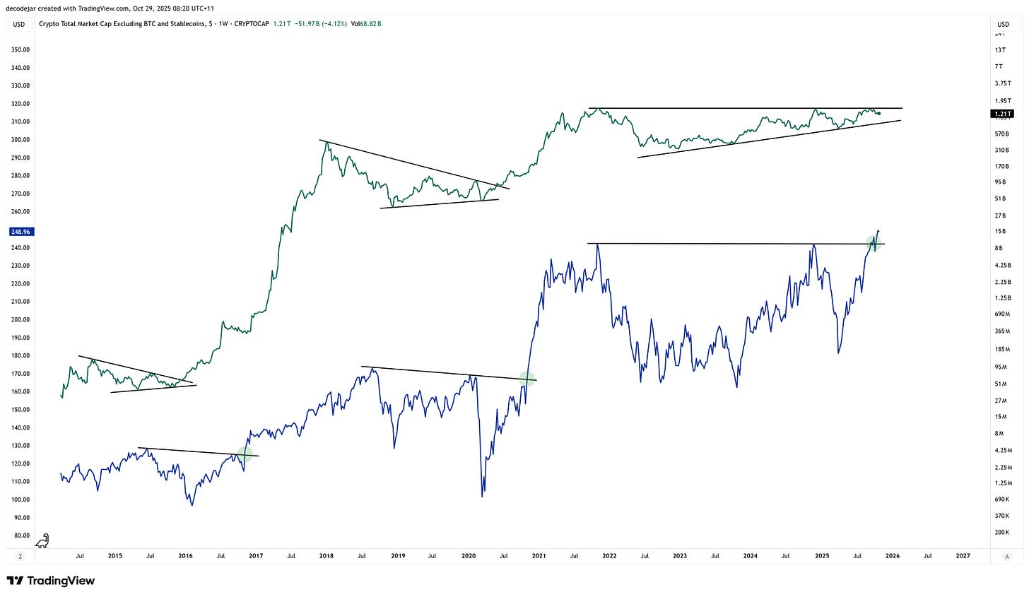 When Altseason? - We’re closer than you think. The one chart that links altcoins to the macro shift and shows why they are coiled for a breakout.